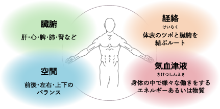 この4要素のアンバランスが心身の不調につながります。それぞれの症状・お身体の状態に最も有効な経穴・ツボを選択し、鍼(はり)灸(きゅう)治療でこれを調整します。